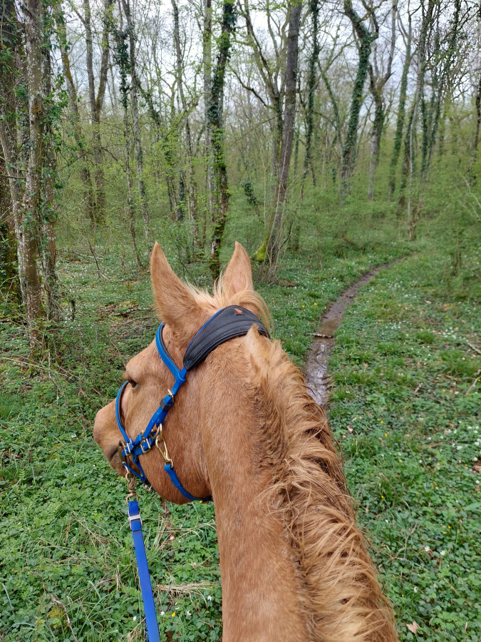 Sortie avec la jeune, 1km600, on va y aller progressivement, c'est assez sport les deux ensemble (elle demande beaucoup de focus + n'aime pas mon cheval, donc de l'avoir à côté, je pense qu'elle prend beaucoup sur elle). La prochaine fois, je le mettrai en LR devant et elle à mon épaule, c'était un peu précipité de ma part de les mettre à côté.