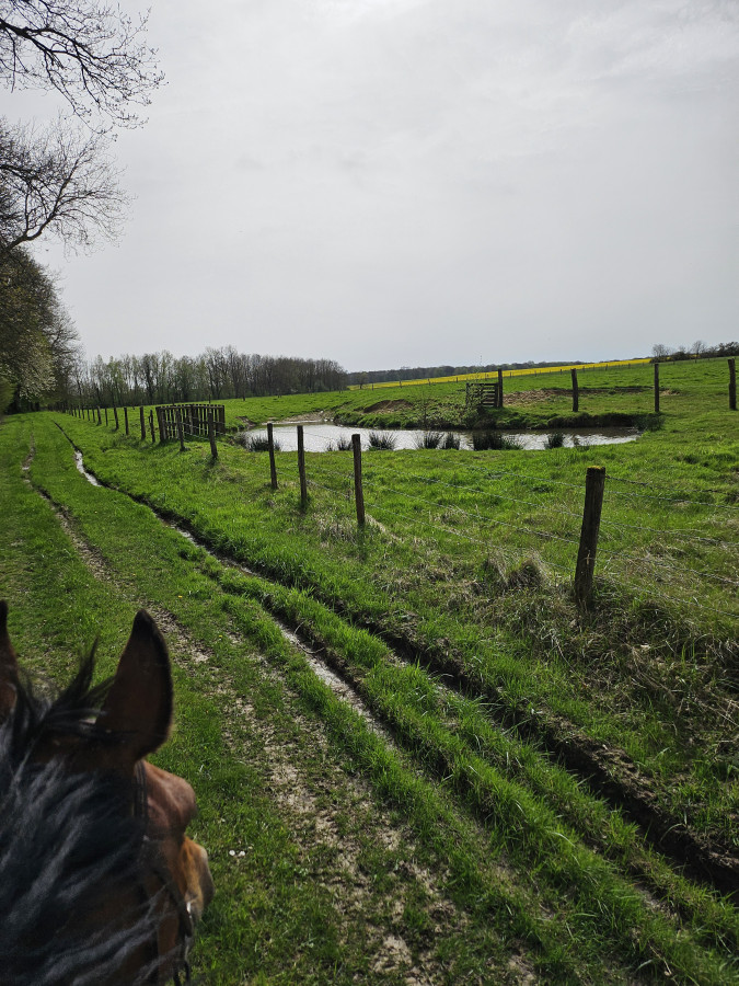 Elle était très en forme au point ou tu longes le chemin mais qu'un fossé nous sépare et que tu dois le rejoindre. On se prend pour un cheval de CCE on suit les traces de véhicule en prenant le passage pour rattraper le chemin, avec toute la pluie qui est tombée ça fait un immense profond gué... L'eau lui caresse le ventre et la pointe du coude On a profité de faire une balnéo ^^