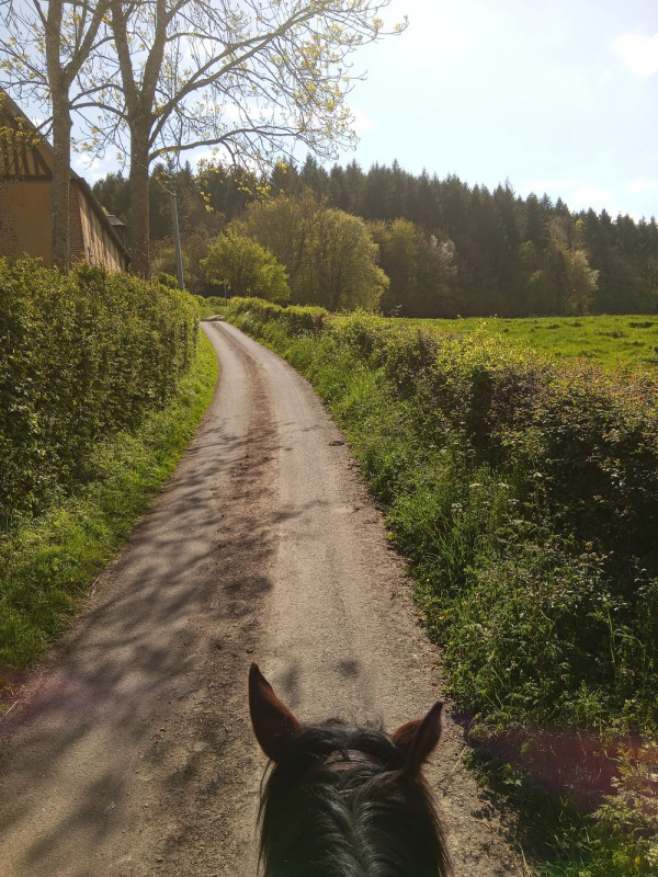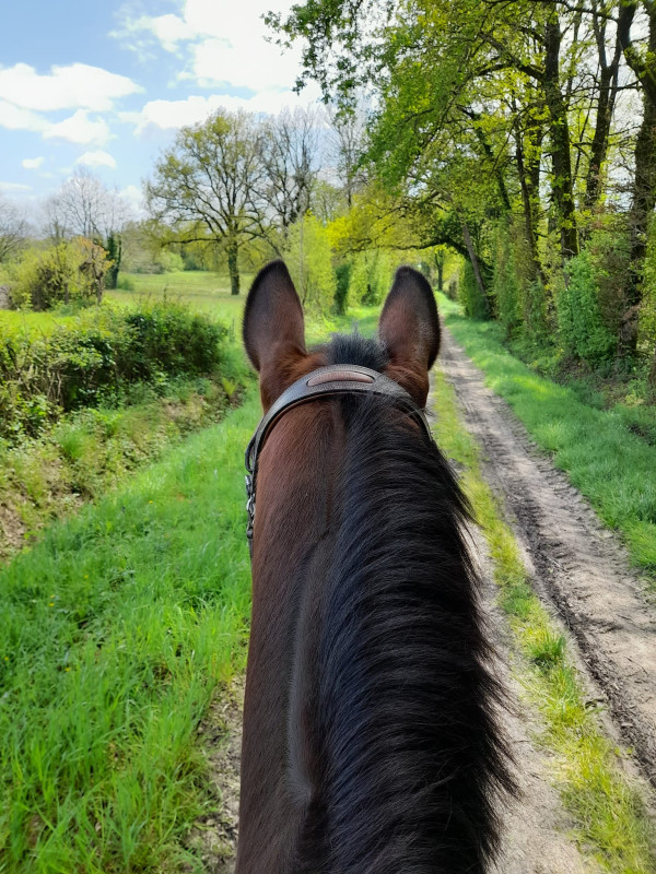 Bonjour à tous, de retour après la période d'arrêt de mon cheval. Il va très bien et est en pleine forme depuis son traitement (carbesia + antibio), il a eu un bon mois de repos et là on vient de reprendre tout tranquillement par deux sorties au pas ce week-end, une en solo vendredi soir et cet après-midi accompagnés de mon chéri et un de nos chiens en forêt ! Ça fait vraiment du bien au moral ! Je n'ai pas regardé les km, j'étais juste trop contente de resortir et mon loulou aussi. On a du faire environ 5-6 km cet aprem, c'était une toute petite sortie.