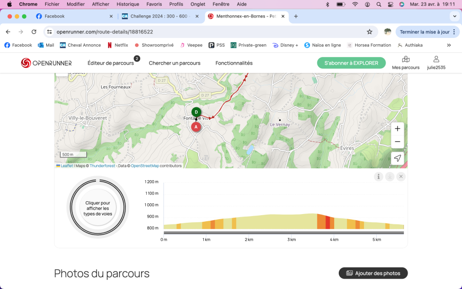 juu_lie Tu traces ton parcours sur OpenRunner ou autre application dans le genre pour savoir à l'avance (là c'est un parcours balisé de vtt donc j'ai récupéré le fichier gpx sur le net), soit tu as une montre GPS ou application et ça te donne le d+ en direct.