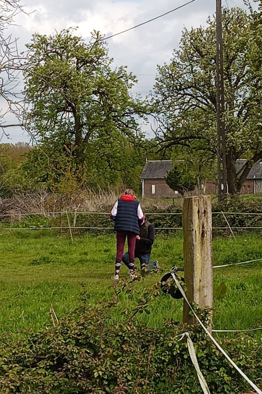 Il m'a même épatée avec la pelleteuse. il s'est arrêté deux fois, a observé puis est reparti, regardant d'un oeil circonspect mais sans fuir. D'habitude (comme il a toujours été poussé dès qu'il faisait mine de ralentir) il accélère pour dépasser ce qui lui fait peur, au risque de faire des écarts dangereux ou de s'emballer à mauvais escient.