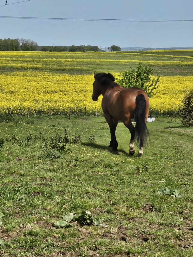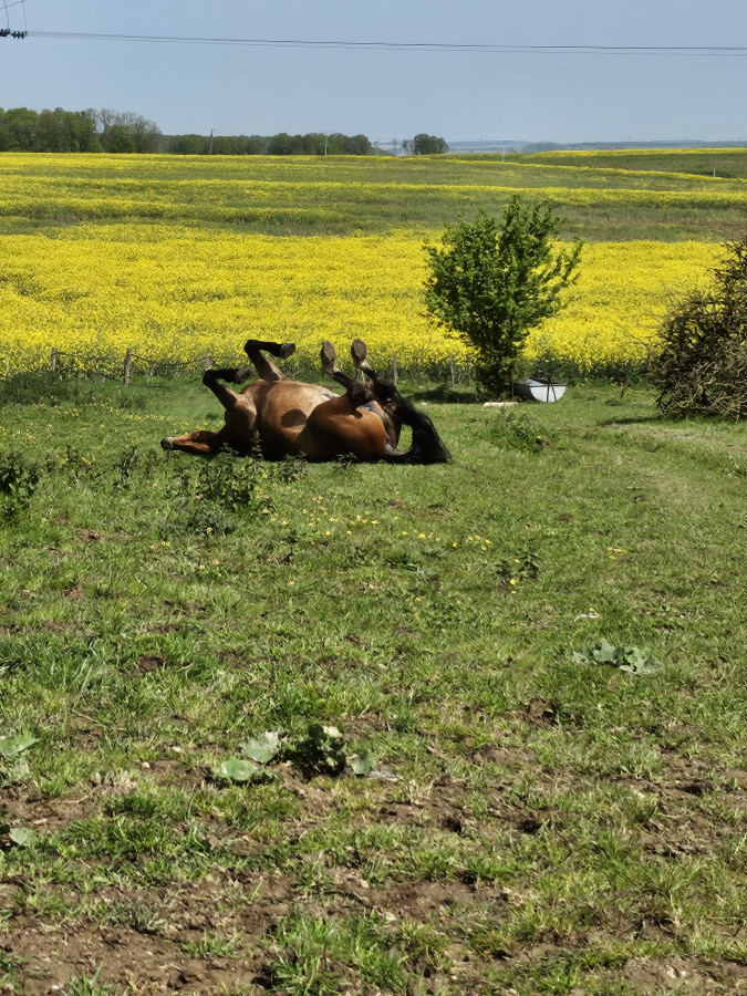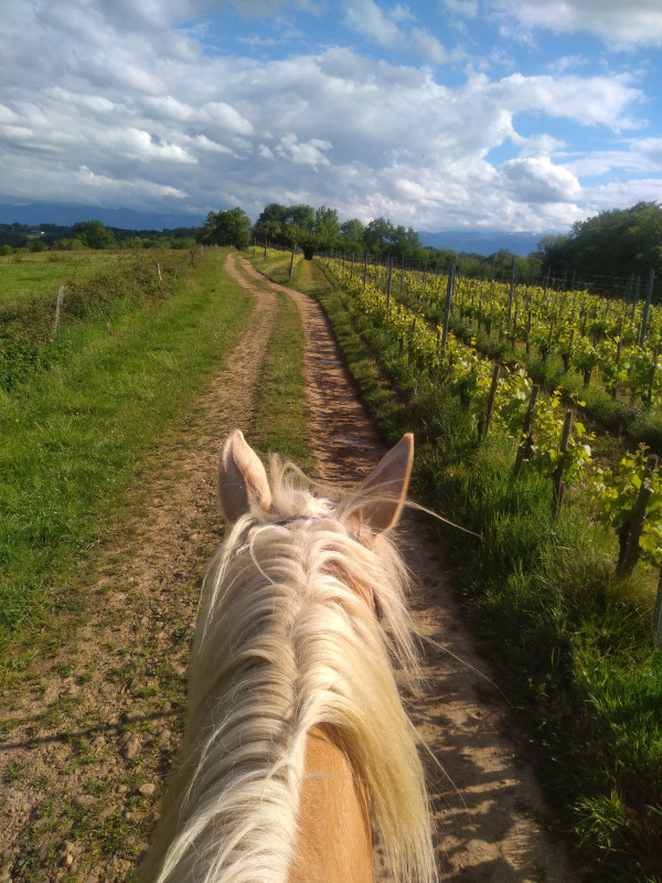 Il fait beau et chaud (coucou l'orage qu'on va se prendre ), par contre les chemins sont toujours dégueu... Ça me soûle, mais on a quand même réussi à galoper sur une petite portion.