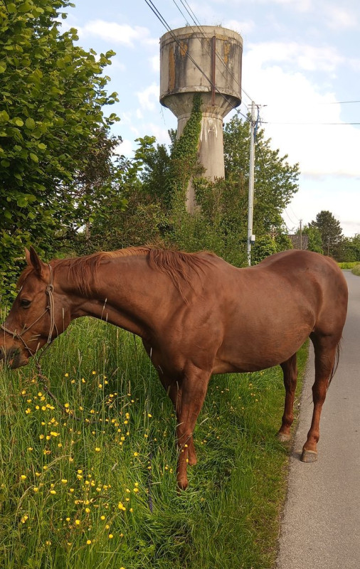 Puis en fin de journée, j'avais promis de sortir brouter à ma vieille Quarter de 20 ans (Lady), alors chose promise, chose due pour 1,5 km très agréables à pieds.
