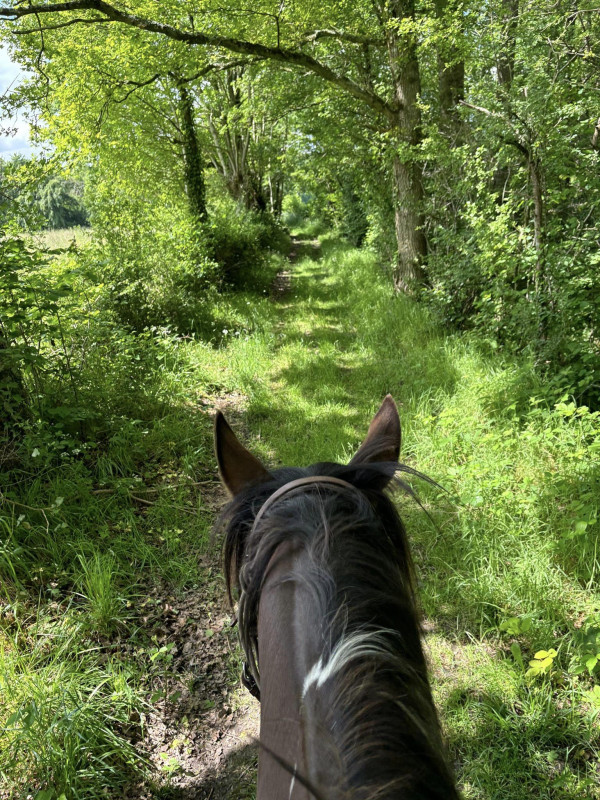 D'abord 10,5 km de balade avec 2 clientes. Le soleil était au rdv alors j'ai pris mon trajet spécial "jolis chemins" avec dénivelé, gués, ligne de trot/galop, sous-bois. Bref le truc qui donne juste envie de rester en balade.
