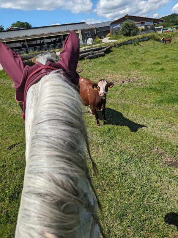 6,3km en 1h15, que au pas comme prévu SAUF les quelques micro foulées que Zaïro m'a volé, il est pas possible lol et le piaffer en passant devant des chevaux au pré