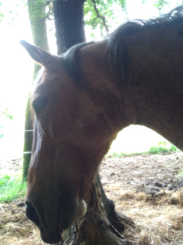 1,3 kms entre les averses, à pied avec Touco pour l'amener brouter et on a été voir le prunier en haut du chemin, il y a des prunes mais pas encore mûres ! Et les 100 dernier mètres j'ai sauté sur son dos a cru juste pour le plaisir, un petit moment avec lui avant qu'il ne parte demain en "vacances" chez sa propriétaire pour la semaine !
