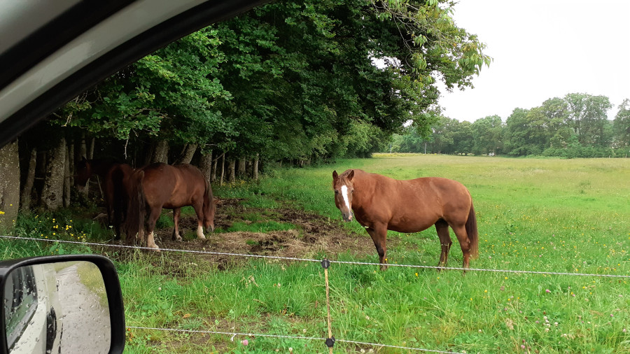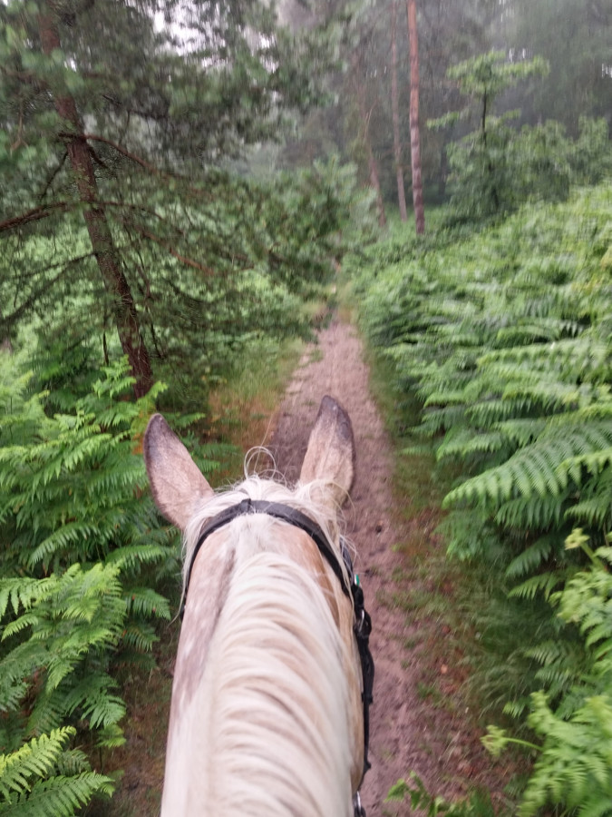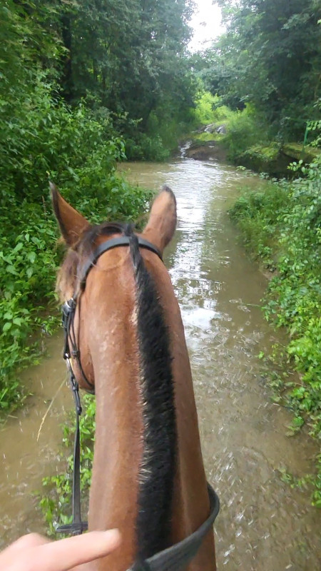 20km ce matin, même pas sous la pluie ! J'ai du monter en botte de pluie car TOUTES mes chaussures sont mouillées et avec ce temps ça ne sèche pas. Mon département subit d'importantes inondations, ça déborde de partout. Gué normalement au genou du cheval désormais au ventre et chemin qui y mène inondé... Va-t-on avoir un été un jour en 2024 ?