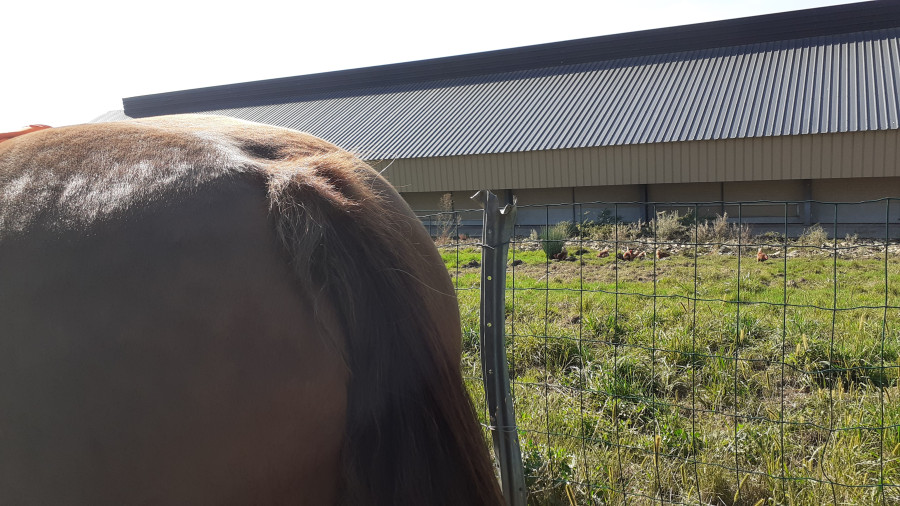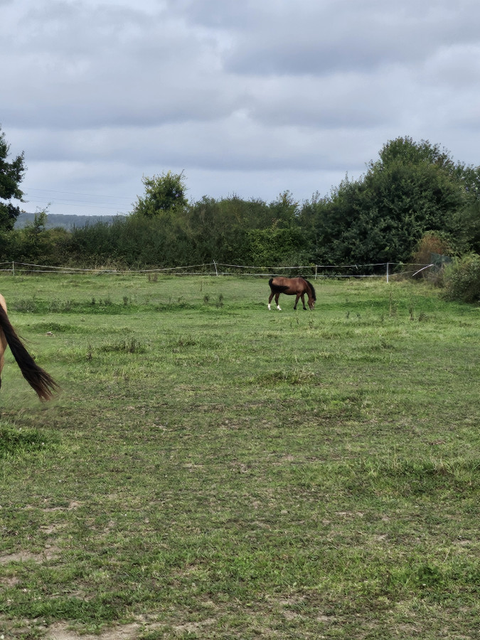 Ajd on est allé promener les chevaux qui avançaient bien, pas long car ma copine avait mal à une jambe, ensuite on les a déposés dans le parc des bois, la colonie de vacances, tous les 2 cette fois car avec les grands chevaux, l'herbe disparaît vraiment trop vite...