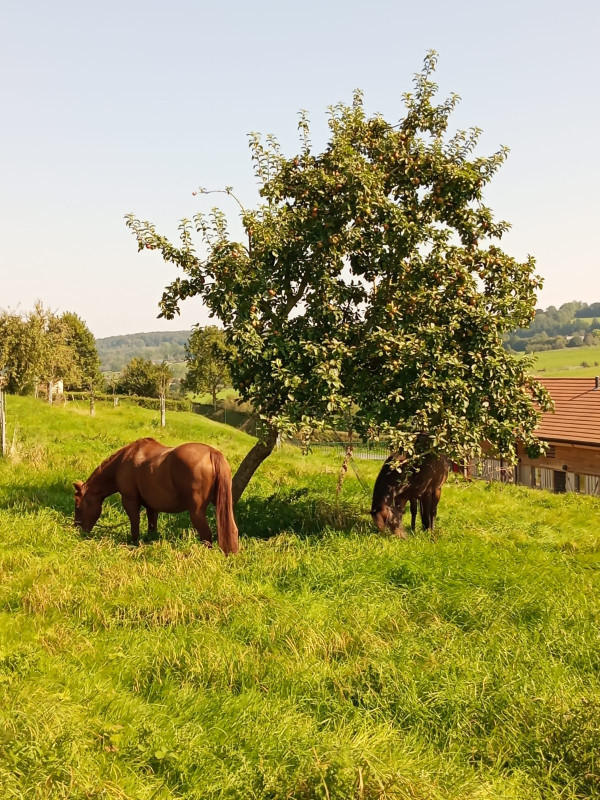On allait jusqu'à la commune de Camembert, puis on est entré sur les terrains de la fromagerie (grâce à un contact) pour faire un picnic pendant que nos deux chevaux se régalaient d'herbe sous un pommier.