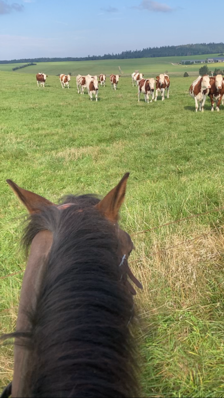 trajet aller : passage de vaches connues, de moutons, pas de soucis meme si y a un moteur qui tourne au ralenti sous la selle. Au retour : la traite est finie et y a 30 normandes qui sont apparues dans un pré qu'on doit longer ... passage sans tentative de reculer ou pivoter, mais énergie assez haute et pépère qui redoute un mouvement de masse ( avec des génisses il aurait fallu que je le laisse accélerer pour gérer son stress). Bon, bien passé, on reviendra les jours suivants pour répéter (en dosant car ferré sur route mouillé je veux pas de dérapage )
