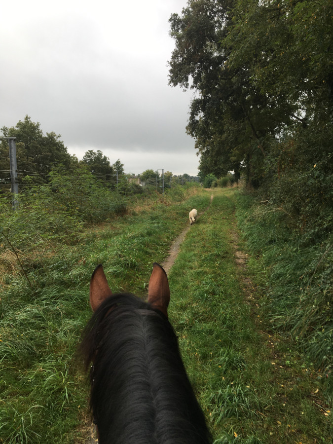 Aujourd`hui, balade à 6 chevaux (et un chien ). On a plein de nouveaux à la pension qui sont sortent pas mal donc ça amène une bonne dynamique de groupe. Le temps était incertain ce matin mais presque tout le monde est quand même venu ! Un petit tour car 2 personnes à pied mais ça faisait plaisir de sortir ensemble !