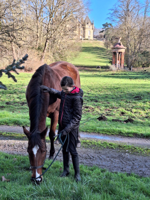Hello ! On revient doucement par ici :) on a fait 3 petits kilomètres en main aujourd'hui dans le domaine des écuries avec mes filles. Gala a été super cool, on a passé plusieurs petits ponts sur le cours d'eau qui serpente dans le parc, sans aucun problème. Elle a les pieds un peu sensibles sur les cailloux, mais le maréchal vient mercredi donc je vais pouvoir en discuter avec lui.