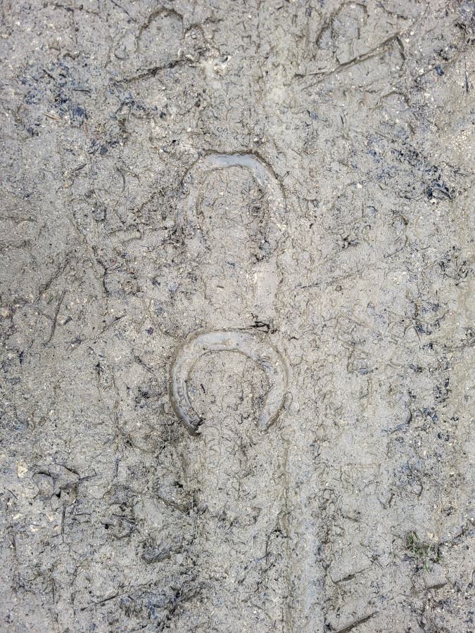 12km ce matin avec une voisine. En promenant mes chiens plus tard, je me suis amusée à regarder les traces de mon cheval (facile vu que c'est le seul ferré), bah je crois qu'il n'a pas de soucis d'engagement au pas vu comment il se méjuge
