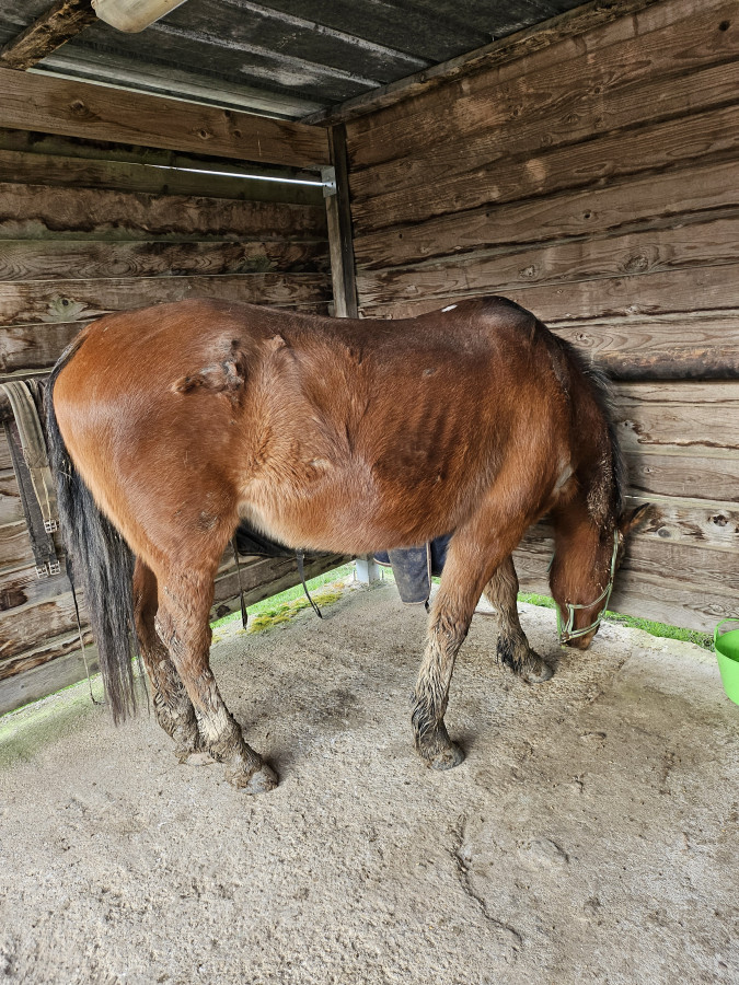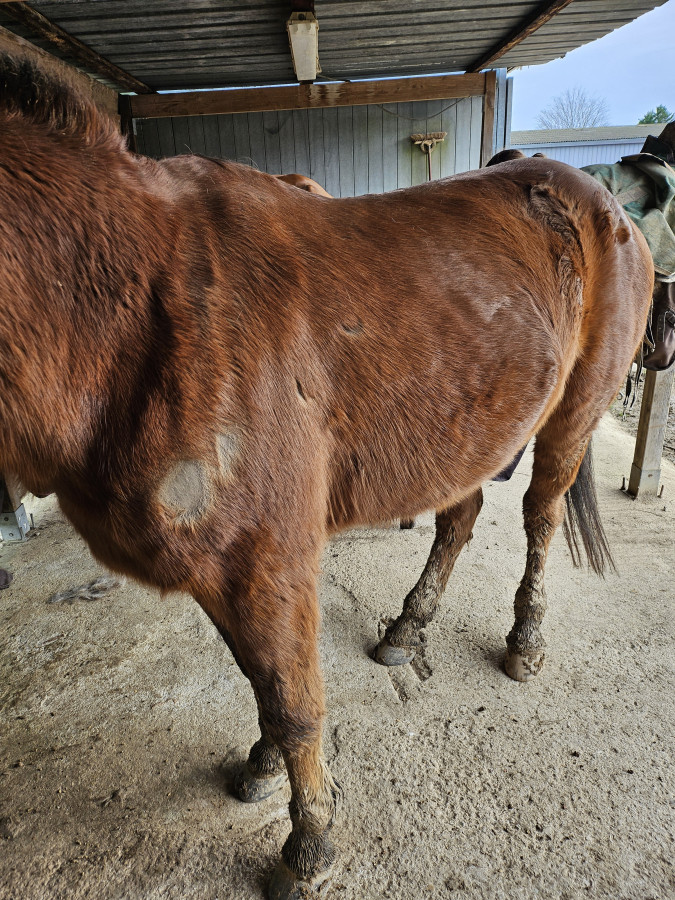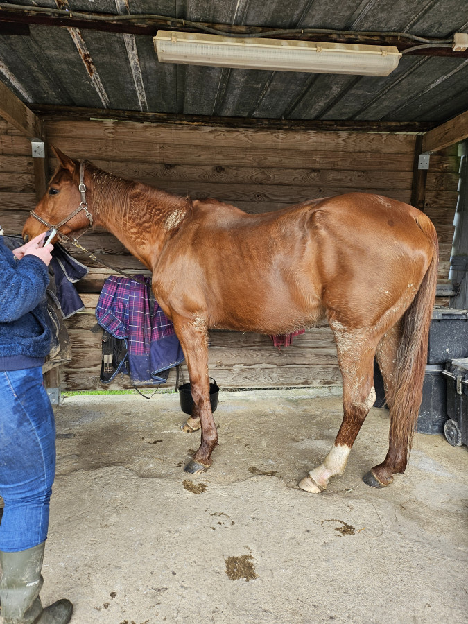 Pour la faire courte, nos chevaux sont en pâture dans la même écurie où est Fifi, ils ont 2 petits abris bâchés dans lesquels ils ne vont pas, le foin est censé est à volonté mais en fait c'est selon leur appréciation, en gros là ça fait 2 semaines qu'il fait entre 8 et 16°, du coup ça repousse un peu, sauf qu'en enlevant les couvertures ce matin on a fait des bonds. Moi, Itsmy a perdu mais c'est pas hyper flagrant avec les poils puis bon il a 28 ans, mais la jument c'est... flippant.