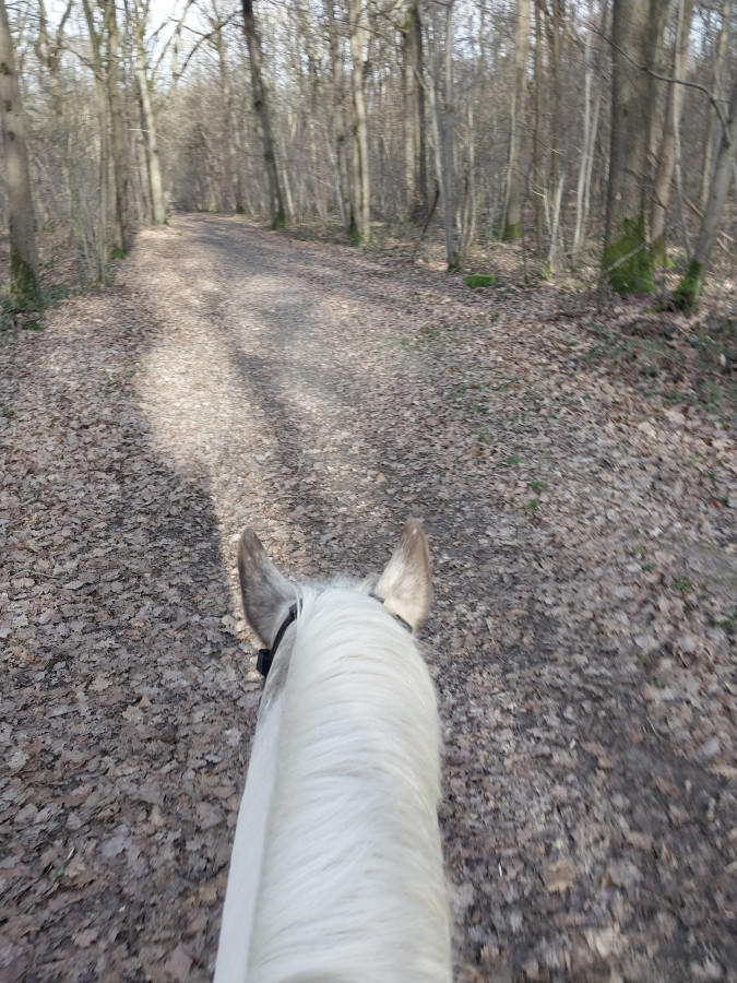 Pour nous 4.4km à pied avec les 3 juments. Ma dp est venue avec moi. Ciel gris un peu de vent mais on a eu chaud en marchant.