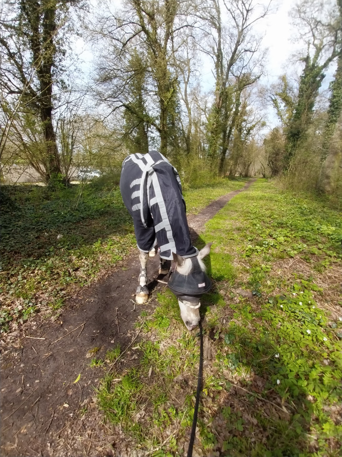 Aujourd'hui + 5km après le cours particulier de dressage, je suis partie en main pournla faire broutter avec la couverture magnétique.