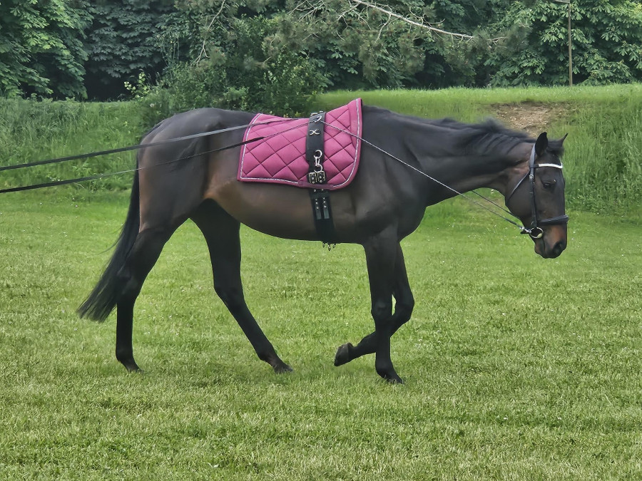 Le concours était sur herbe, ça change ! Par contre, le cheval qui tente d'en profiter pour brouter à l'arrêt