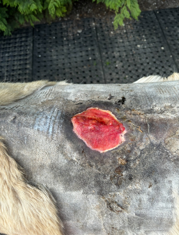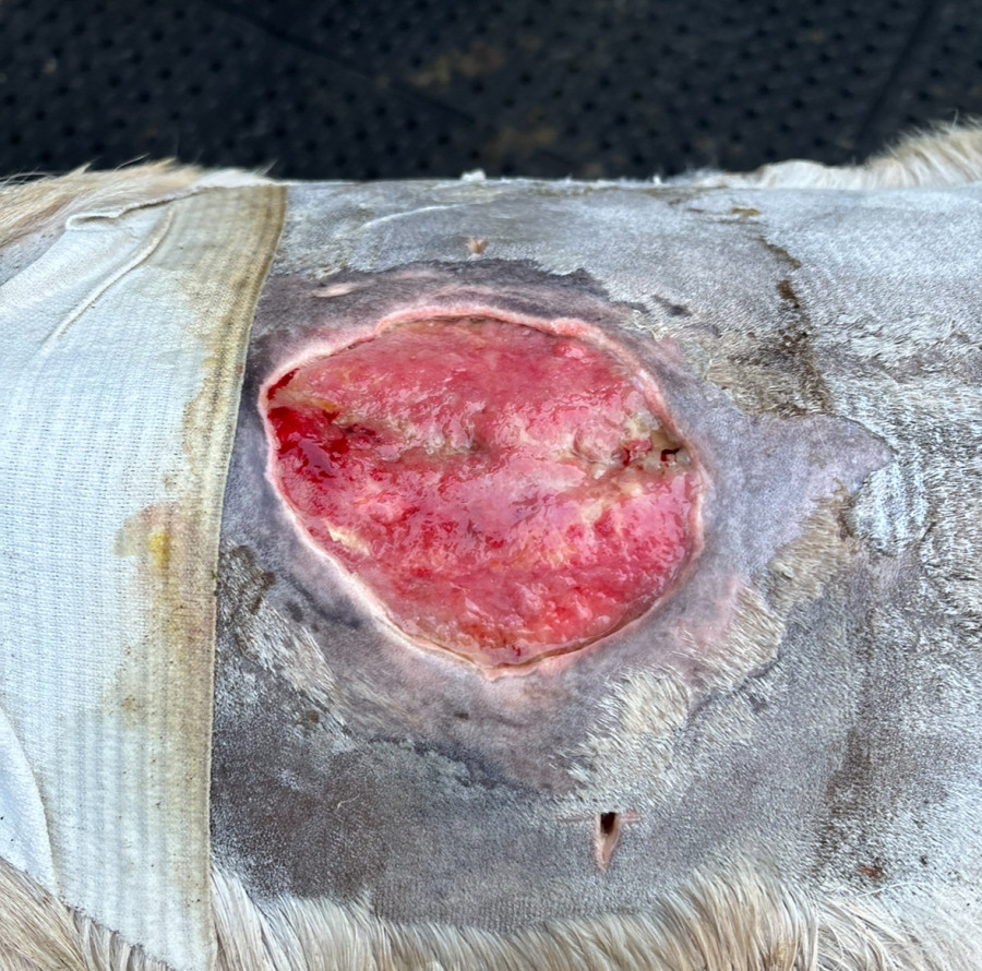 Sous pansement, ça cicatrise plus vite. Il faudra du temps vu la taille, mais ça va bien!