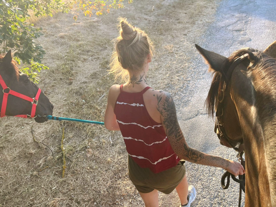 On ne veut pas rester sur cette mauvaise note, je décide moi de récupérer la jument, on marche en main, on fait redescendre la pression, je la désensibilise pour monter, je bouge tout et partout, et une fois sur qu'elle ne bouge pas, je monte dessus, elle s'est calmée, elle n'a pas bougé. Super