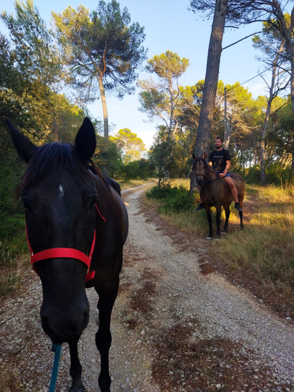 Et nous voilà partis pour un petit tour en extérieur, 20min environ, jument posée, on a même un peu trotté pour rattraper les garçons qui prenaient de l'avance