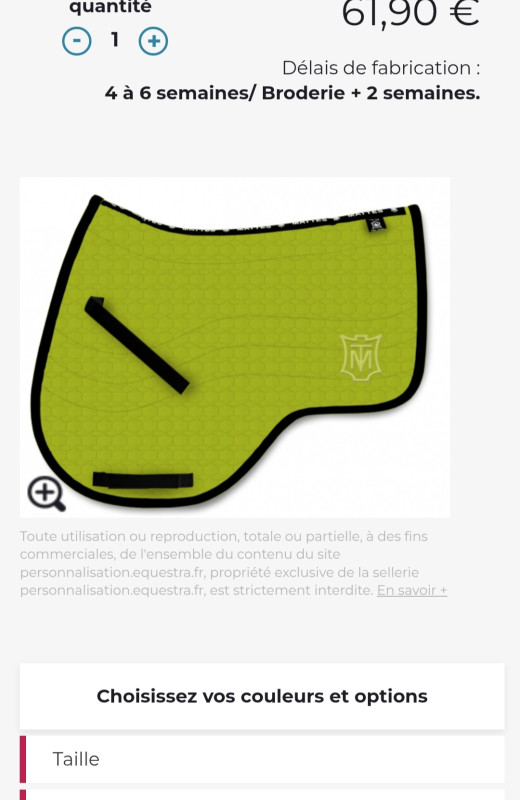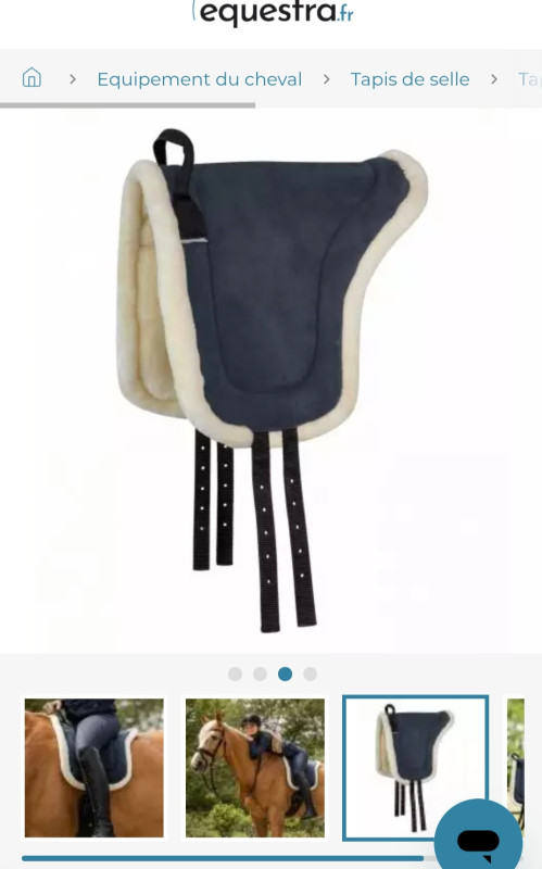 Et au même site que le licol ils vendent des tapis de monte à cru pas très cher, je pense qu'en même temps je vais en récupérer un, ce sera mieux que de monter sans rien, et c'est pareil dans ce cas que mettre un tapis et un surfaix, donc tant qu'à faire ça peut être pas mal pour le peu que je le fais et ferais