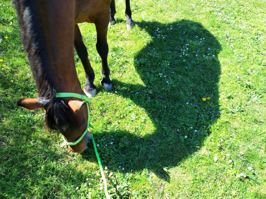 en plus avec la longe qui traîne comme ça c'était pas facile, il a du mal à comprendre pourquoi je suis cachée derrière ses fesses...alors il se plante impassible...ou tourne en me cherchant...j'adore