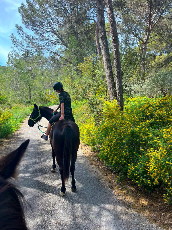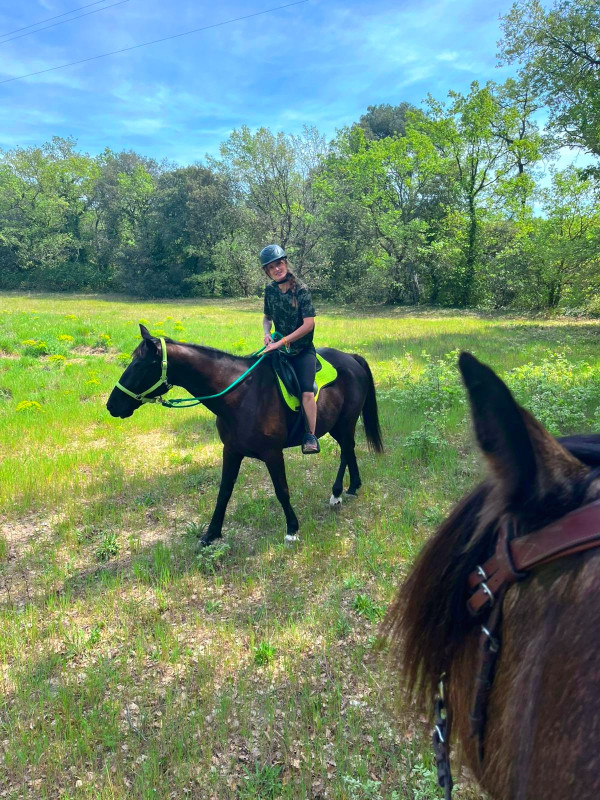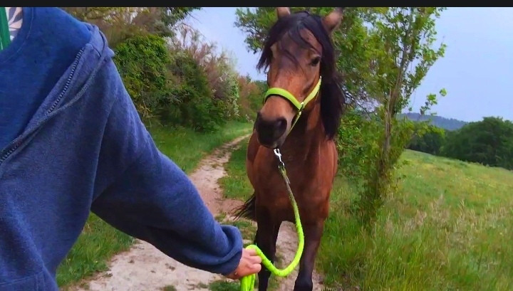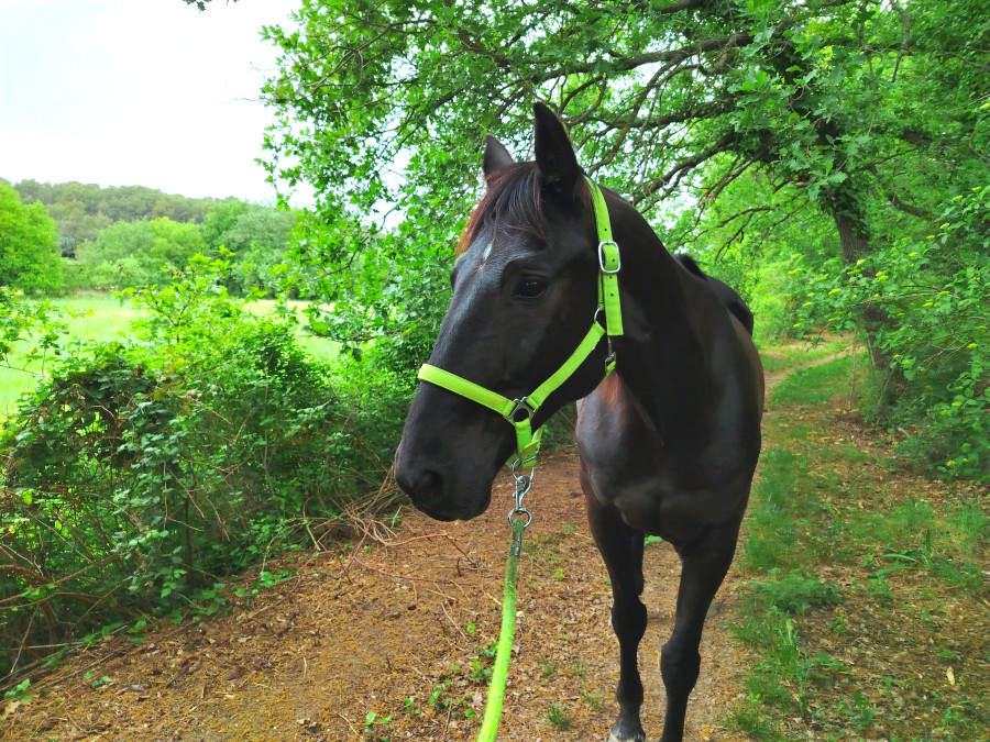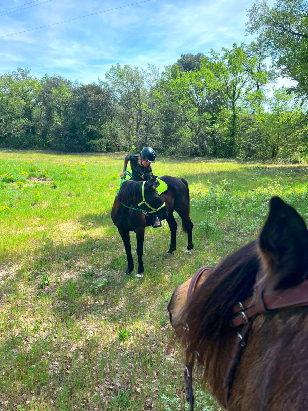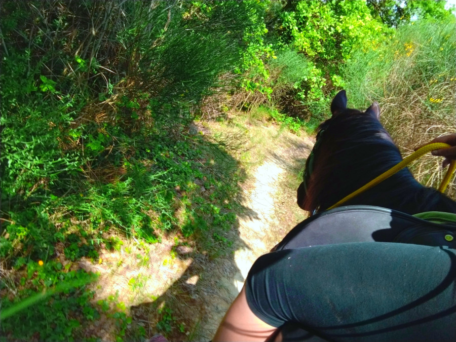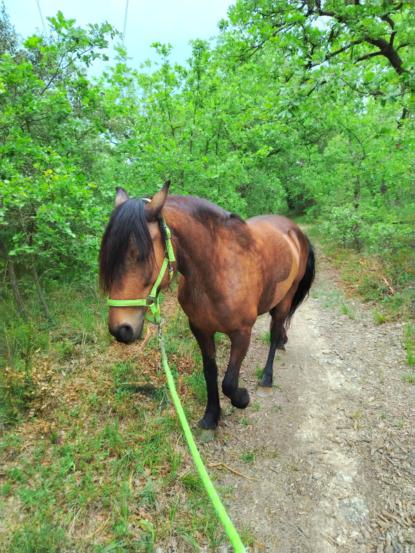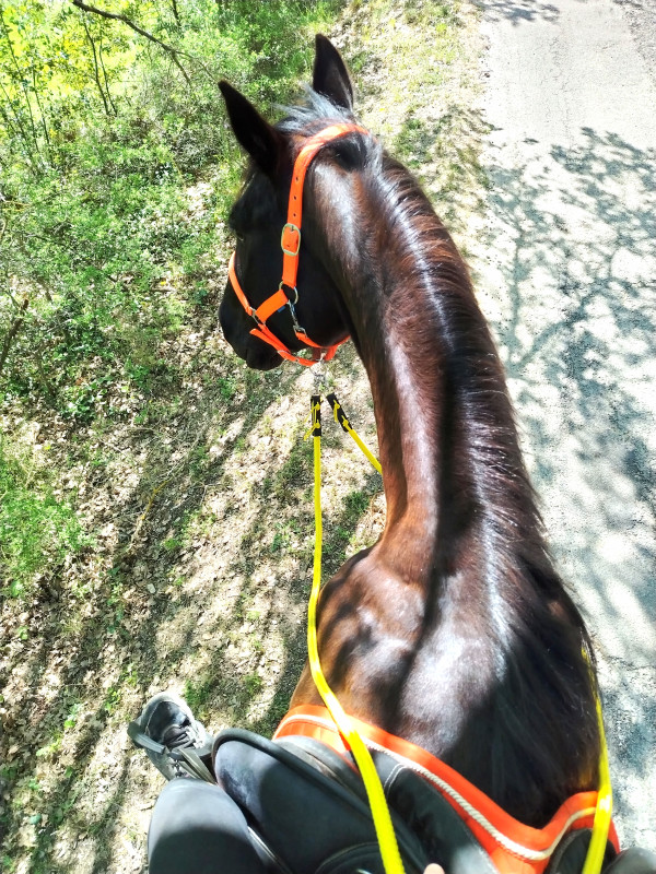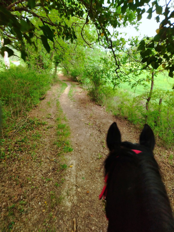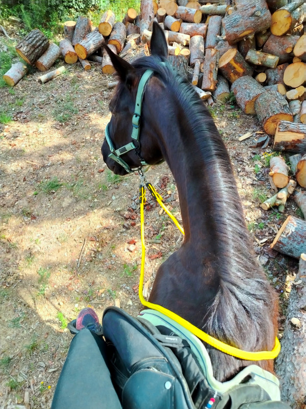 ) ni une ni deux je la reprends dans mes jambes correctement et lui demande d'avancer, j'ai senti qu'elle avait envoyé un peu les fesses, et on continu notre ligne, elle prend de la vitesse, j'accepte tout en temporisant, on repasse au trot, en haut elle reprend le pas, je lui demande donc un effort supplémentaire, on reprend le trot au tournant sur un petit chemin, et cette fois bien dans le calme nous finissons cette partie, on repasse au pas, et on finit la balade en marchant