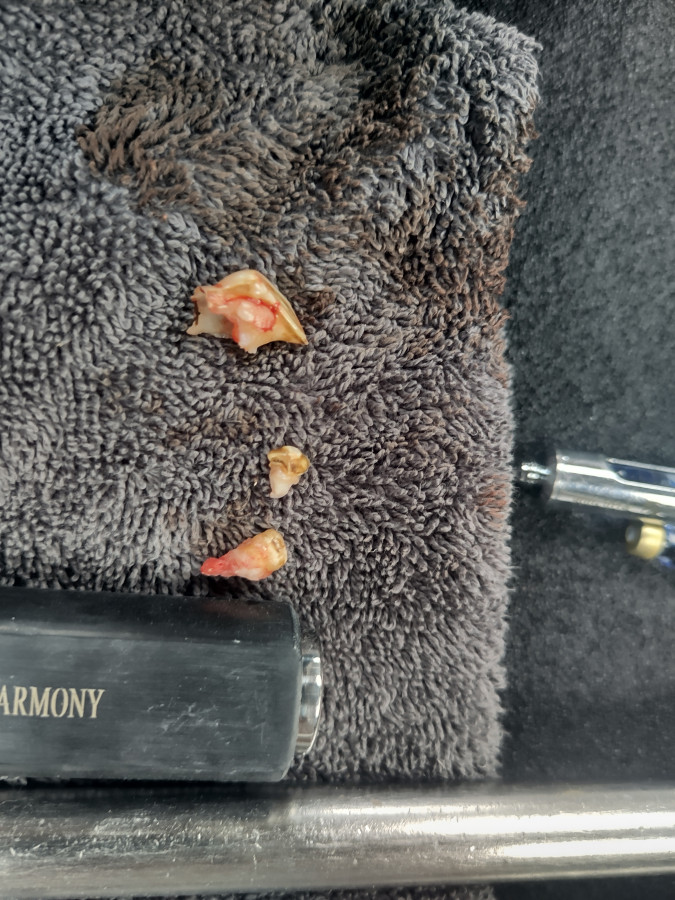 Il m'a montré la langue et les joues qui étaient blessées par les surdents, j'ai failli garder les trois dents extraites