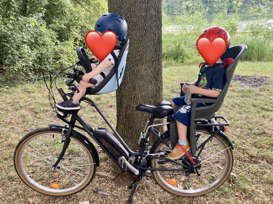 De toute façon tant que je n'ai pas eu une véritable béquille, c'était impossible de prendre les deux en siège ! Littéralement impossible avec ce guidon qui bouge de son propre chef. Je ne peux pas tout tenir en même temps. Il aurait fallu être deux pour les installer. La, en théorie, la béquille suffit (s'ils ne bougent pas comme des dingues) mais je double toujours d'un autre appui pour garder le vélo en équilibre.