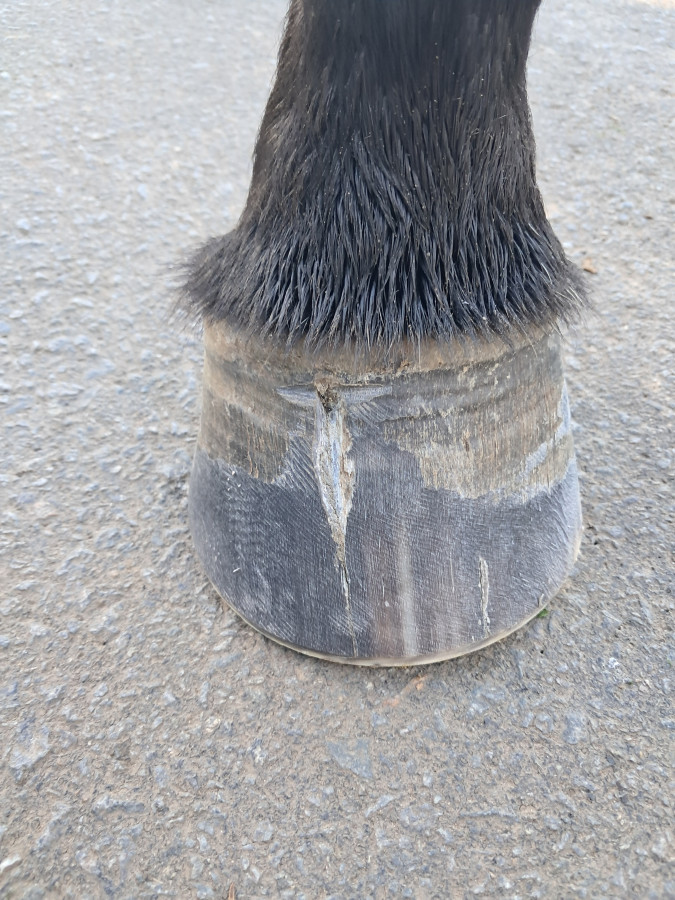 Ça ne ressemble pas a une seime, plutôt une sortie d'abcès (il me semble voir un petit trait horizontal en haut de la fente), auquel cas ça va descendre gentiment. J'ai eu le cas sur plusieurs chevaux cet été, ça ce gère. Par contre effectivement c'est en descendant que parfois ça pète arrivé en bas, donc il est bien d'avoir un maréchal présent pour anticiper/limiter la casse.