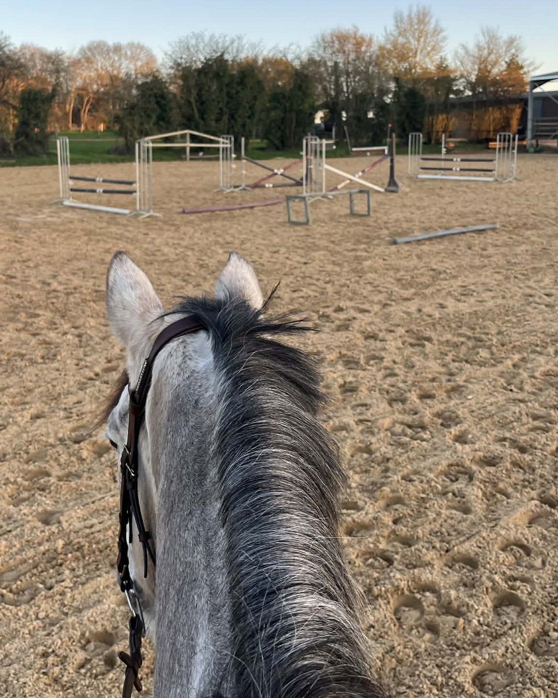 Mercredi, petite séance de travail sur le plat. Pas embêté le poney avec le niveau de sa nuque pour une fois, juste cherché la décontraction. Beaucoup de travail au pas avec des flexions en début de séance sur le spring garden. Un peu pareil au trot et au galop ensuite. Je l’ai un peu plié. Franchement agréable à monter, léger, même si un peu bas dans la nuque. J’avais installé quelques barres au sol au trot dans la carrière, on a été faire ça. Petites transitions au galop après les barres pour dynamiser. Il se tend et pousse bien. Et puis vu que le carré était monté, pouf, une petite répétition de la reprise (même si pas dans une attitude de présentation). Franchement propre. 35 minutes, c’était plié, contente du Juju.
