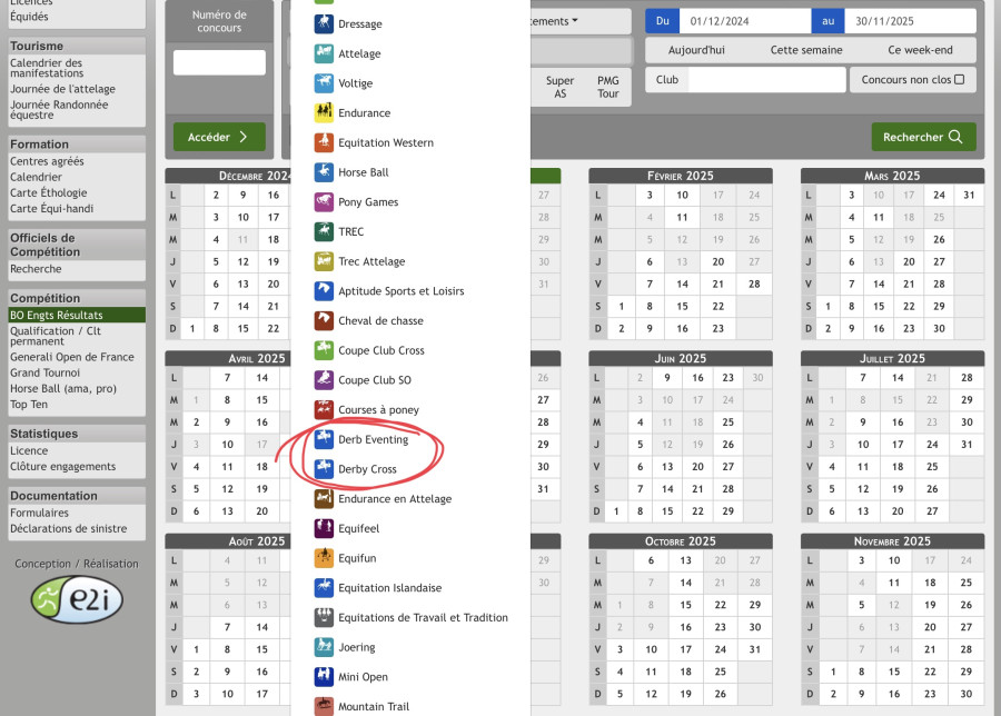 Je m’explique : sur le ffe club sif (club), il est possible de faire une recherche directe de concours derby. Ce qui n’est pas le cas sur la ffecompet (pour amateur) ou il est possible de choisir seulement entre complet et CSO… Sauriez vous donc comment et où est il possible de voir les concours derby programmés ?