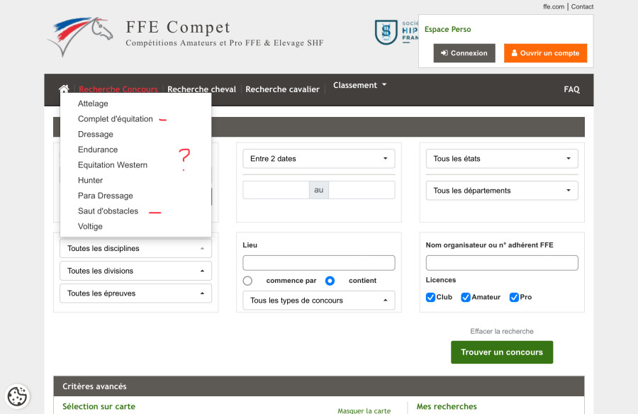-je poste les photos des interfaces de recherche concours de la ffe pour que vous puissiez voir de quoi je parle :