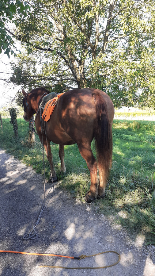 +4.2 km tranquilles. Après un peu de mise en place en carrière, j'emmenais sur la route une cavalière améliorer sa position de trot en extérieur.