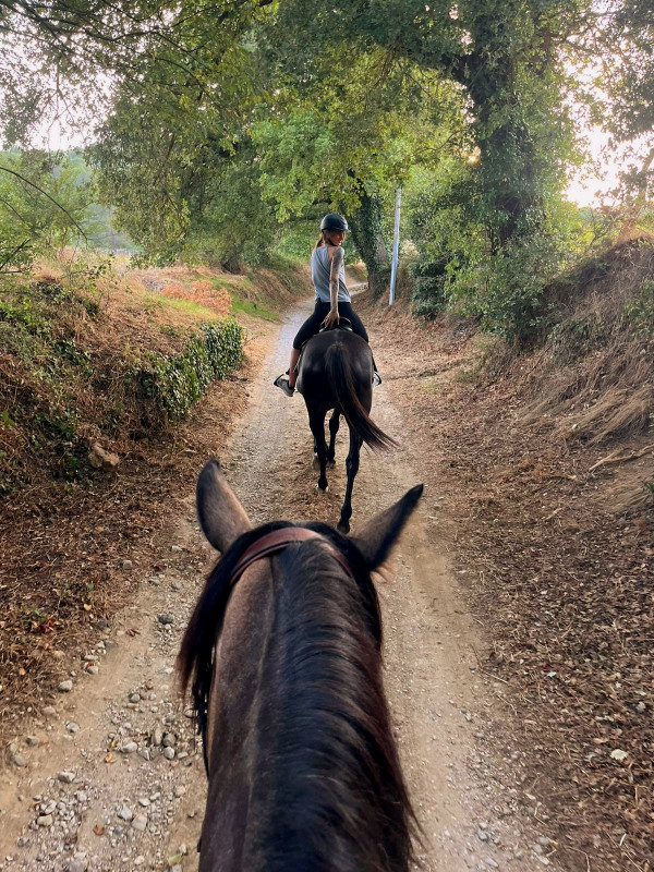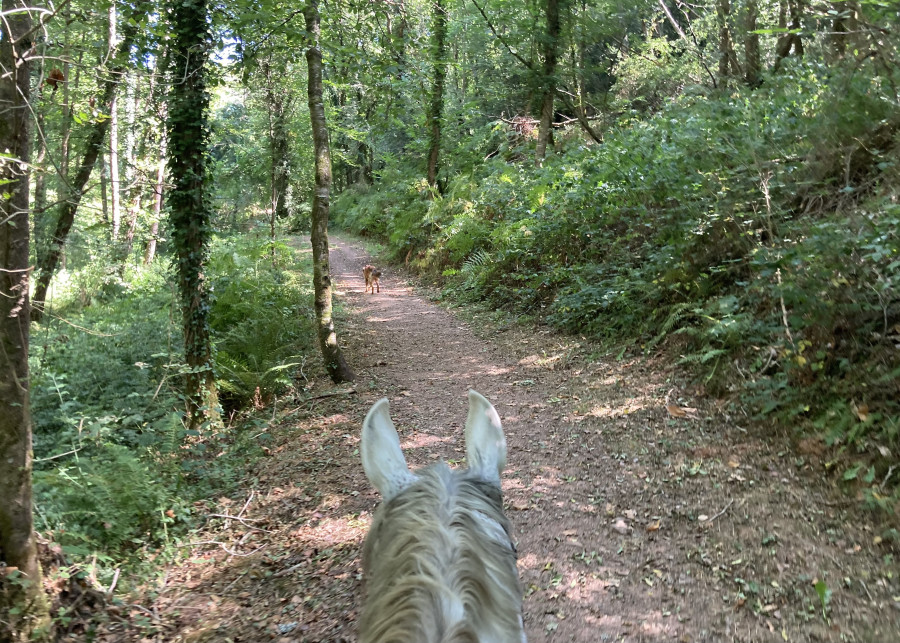 Une fois à la voiture, pansage, vermifuge, (merci les poires) et on est parti en longues-rênes. Je me suis placée devant, il n'y avait plus le gros cucul de Lotus mais Elliot est resté sagement derrière. au bout de quelques mètres, il était calme, à l'écoute, j'ai retiré la longe (remise que pour traverser les routes)