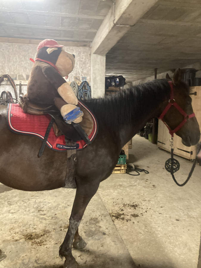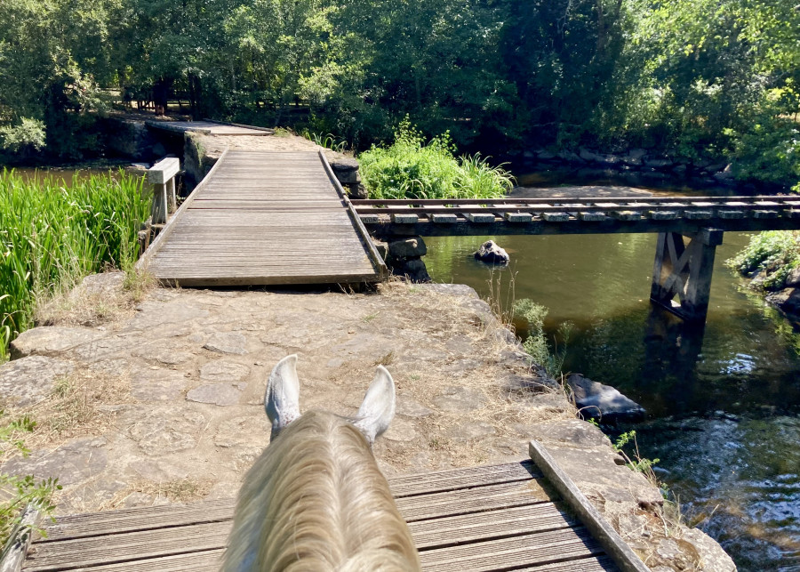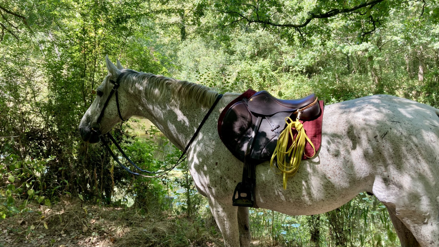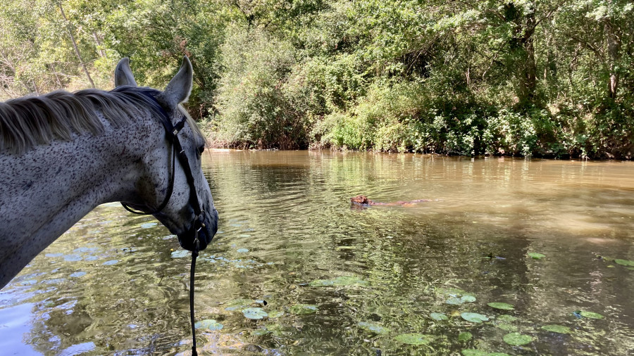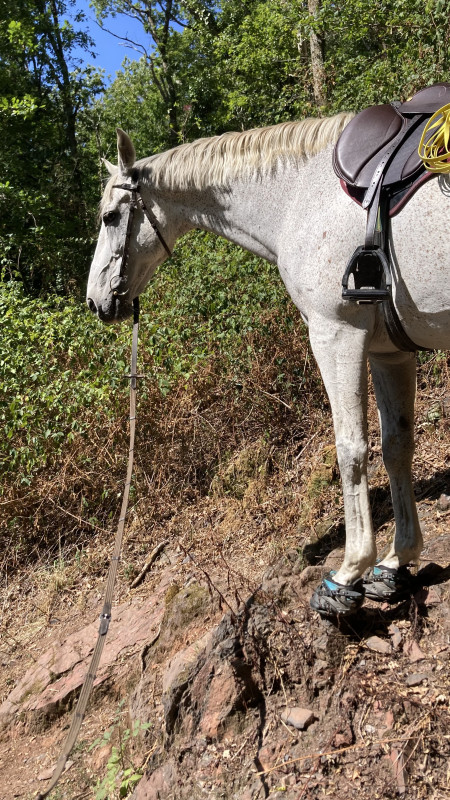 Arrivé sur la route ça s'est corsé, on a longé l'autre côté donc cela l'a tendu. Et le passage d'une troupe de motos l'a fort inquiété, quand j'ai vu qu'il levait la tête, poitrail en avant, je l'ai saisi avant qu'il panique et on a fait une pause-retour au calme. Ensuite je suis un peu re passée devant, puis sur le côté, impec. On voit que c'est "dur" mais qu'il prend sur lui pour être courageux.