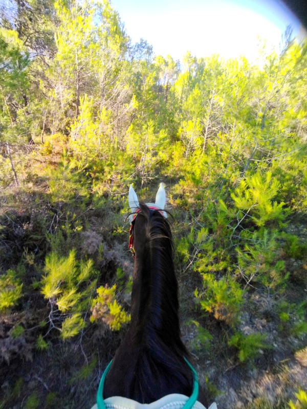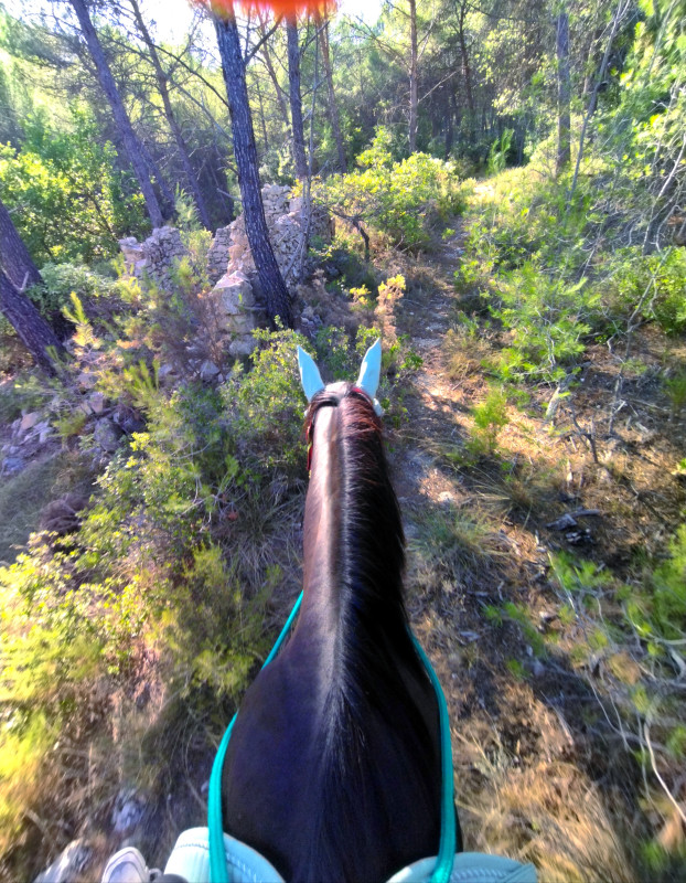 Du coup Mia un peu inquiète . J'ai donné "un coup de pied " avec mon stick en bambou à l'âne. Ça lui a fait se taire, mais il nous suivait..