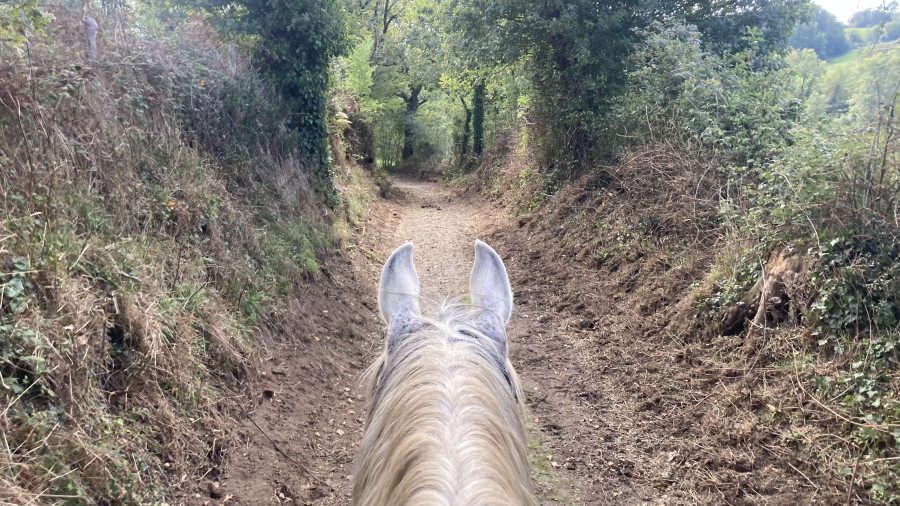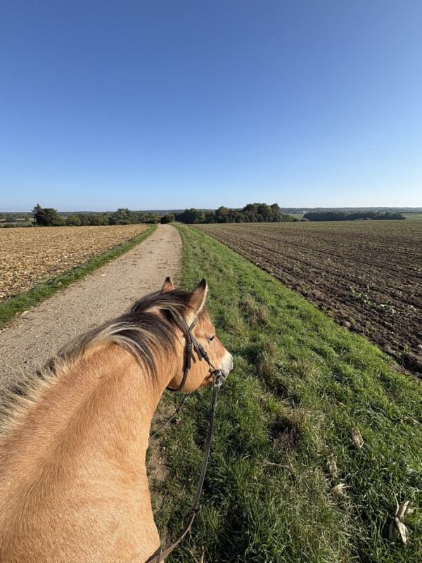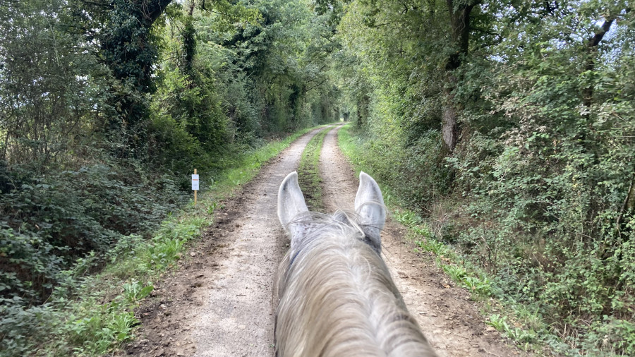 A un moment on galopait avec une autre cavalière rencontrée en chemin. Je réalise que je suis en train de perdre ma longe. La cavalière a continué alors que je repassais au pas. Le Poilu n’a pas trop aimé la blague, il a trottiné une ou deux minutes avant de se poser.