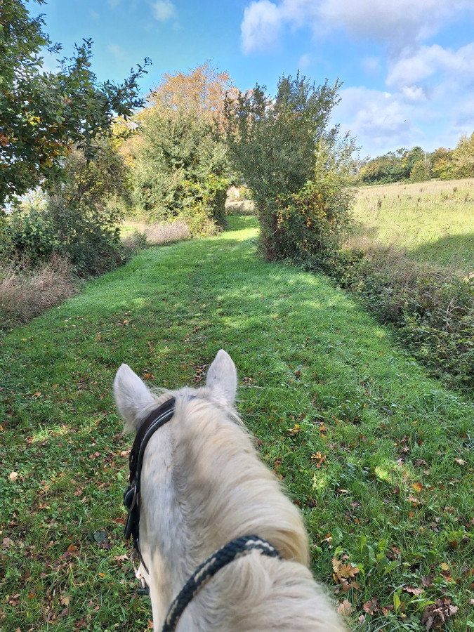 Ce matin on part, et tout le monde était en train de faire la boude a cause des rafales de vent, puis on voit des chasseurs au loin donc on a changé de plan de balade. Pareil un mec nous a doublé en voiture, et a fini par ouvrir sa portiere pour lacher son chien dehors et le faire courir devant son auto et sur le retour une vache est arrivée par au dessus dans un champ et la jument a vu au dernier moment et elle a tenté de partir loin