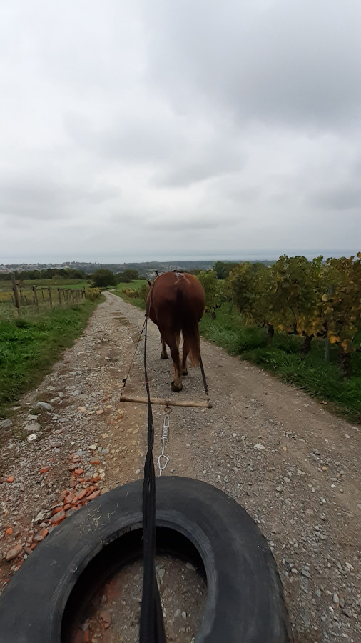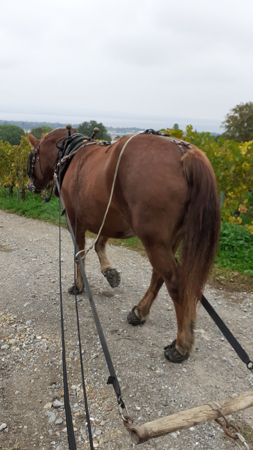 Puis j'avais envie de faire un peu de traction de pneu ( maintenant qu'on est juste à côté) alors on a fait 3.9 km de traction de pneu. Elle était sage, elle n'a pas bougé puis s'est bien mise en place pour accrocher le palonnier et le pneu. Puis elle semblait contente de tirer. Bon elle a un peu transpiré car la moitié est en montée.