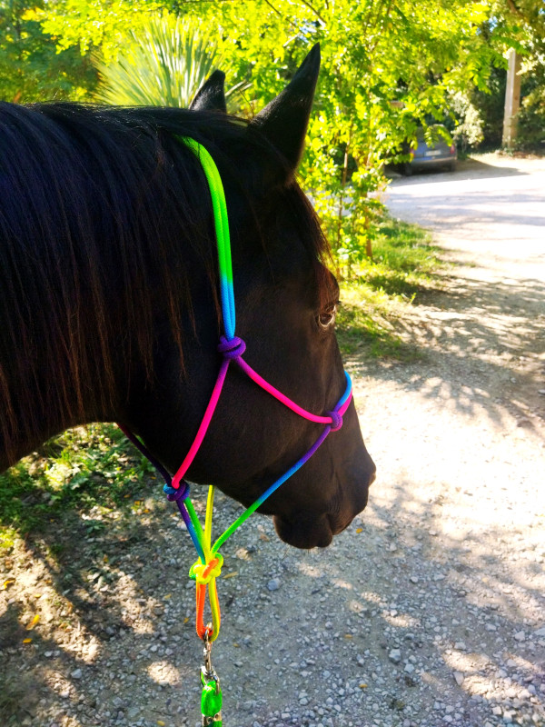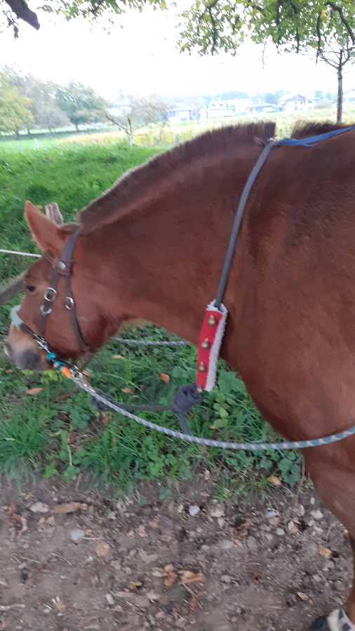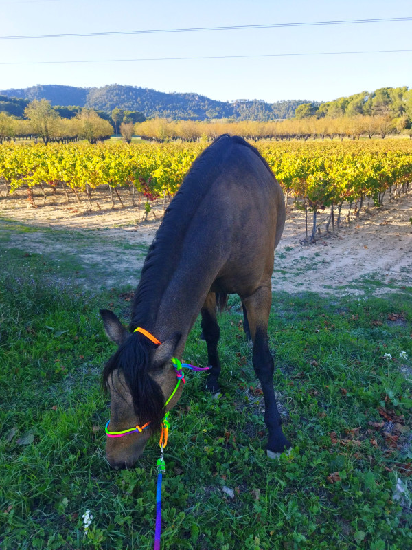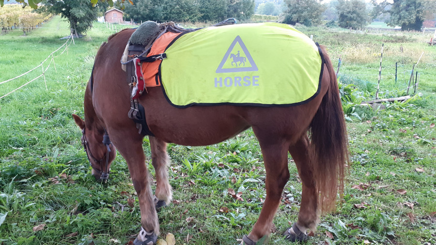 sur le cheval j'accroche un tube d'identité pour chiens avec mon numéro de tel et celui de Pascal.