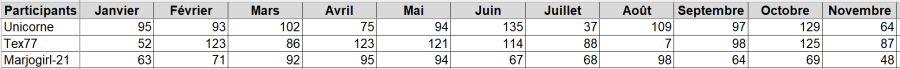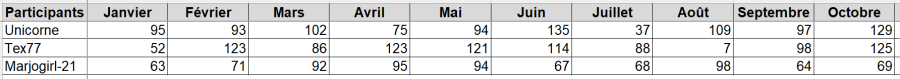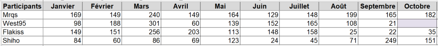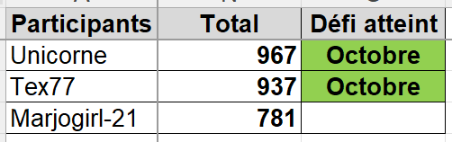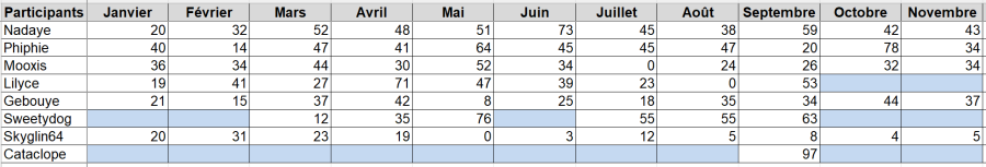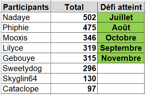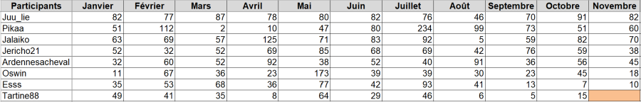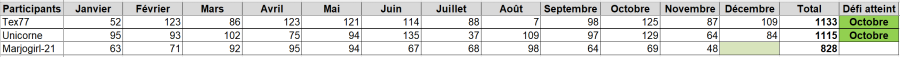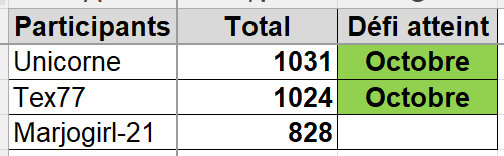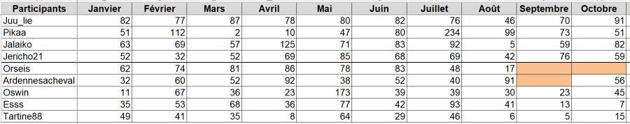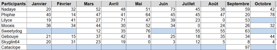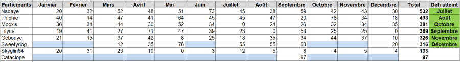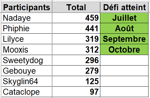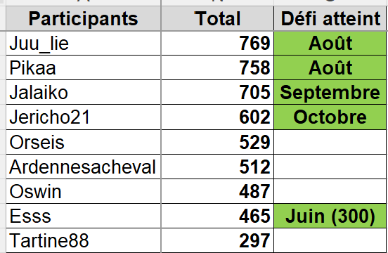 Voici le bilan du mois d'Octobre. Il a visiblement été bénéfique et plutot beau quand on voit le nombre de personnes qui ont bouclé leur challenge ce mois-ci !