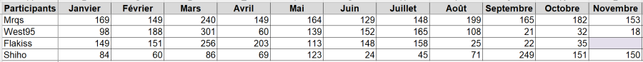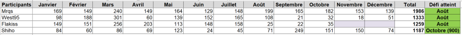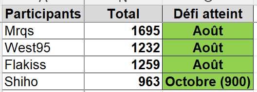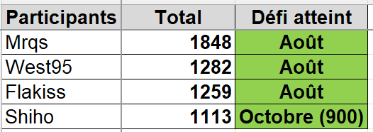 Félicitations à phiphie, à pikaa, juu_lie, à mrqs, west95, et à flakiss qui terminent tous leurs challenges respectifs ce mois-ci !