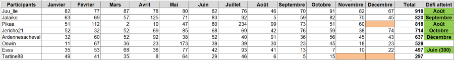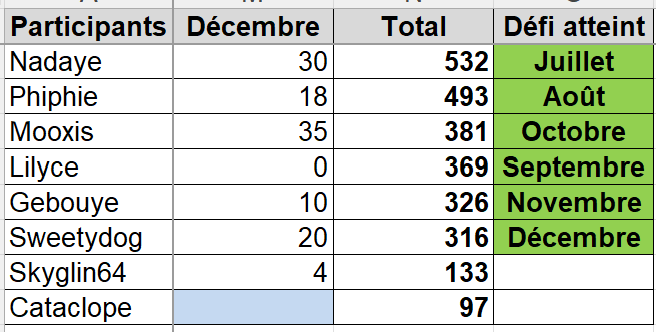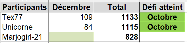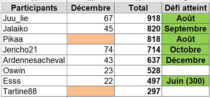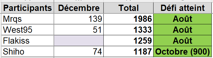 Je ferai les derniers comptes début janvier. Si j'ai le temps je préparerai le challenge 2026 et le formulaire d'inscription semaine prochaine, sinon ça sera en même temps que le décompte