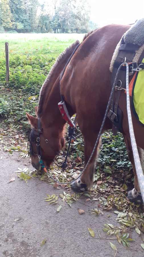 3ème cercle au trot précipité, puis il s'est mis au pas et on est parti sur le chemin. Chemin en côte douce mais constante avec un chemin caillouteux (il n'est pas ferré) et un large accotement herbeux. Ca lui picotait les pieds et on l'a mis dans l'herbe, il s'est vite calé dans l'effort (hé oui une calèche 4 roues + 2 adultes est plus lourde à tirer qu'un sulky avec 1 seul passager) Son ancien sulky faisait 30 ou 40 kilos je crois, là il en était à 260 ou 280. La voiture est légère et "roulante" mais le chemin peu tirant et le cheval n'a aucun condition physique.