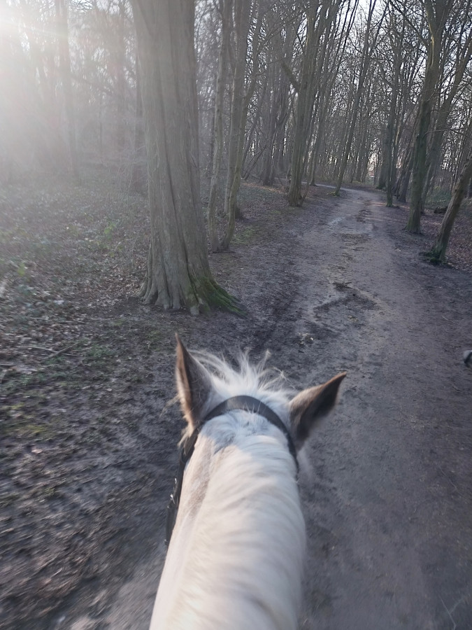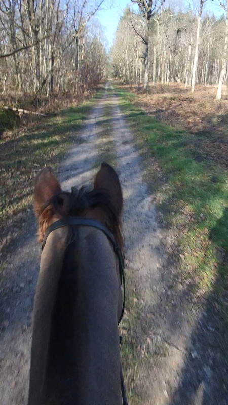 Aujourd'hui balade mis à pieds et à cru (pas longtemps mordicus je lui fais pas encore assez confiance. A tout moment j'éternue et chao poney. L'introvertie qui d'un coup peu vriller pour un bruit inattendu ).