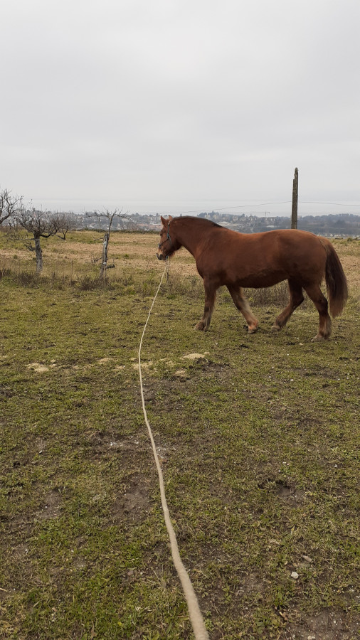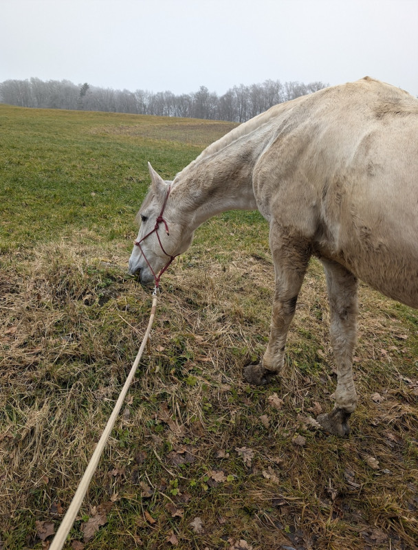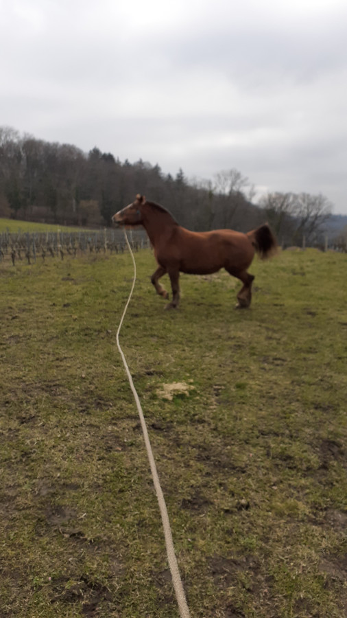 + 1.9 km en longe après une séance en longe dans la carrière en herbe ( pour voir un peu comment elle bouge à des allures autre que le pas .)