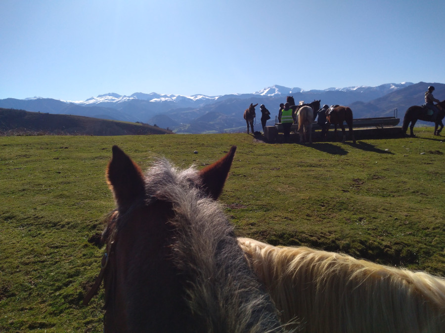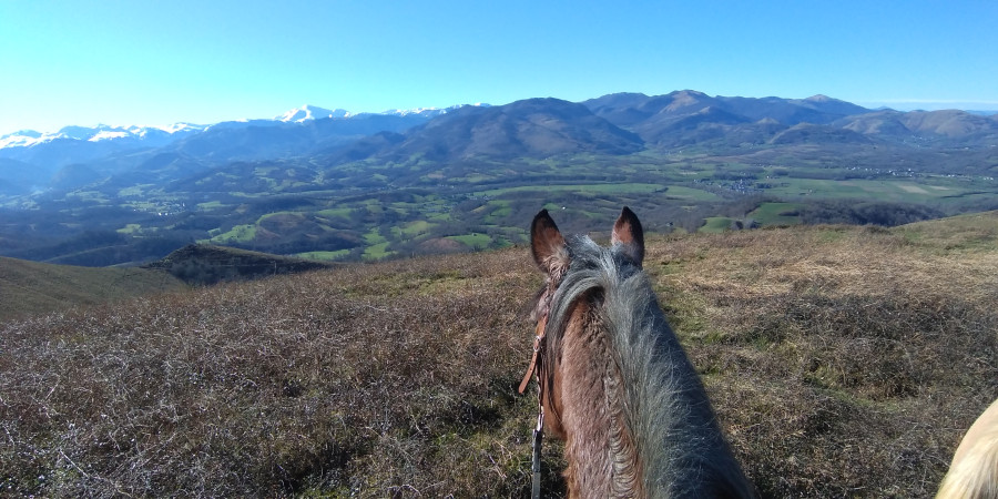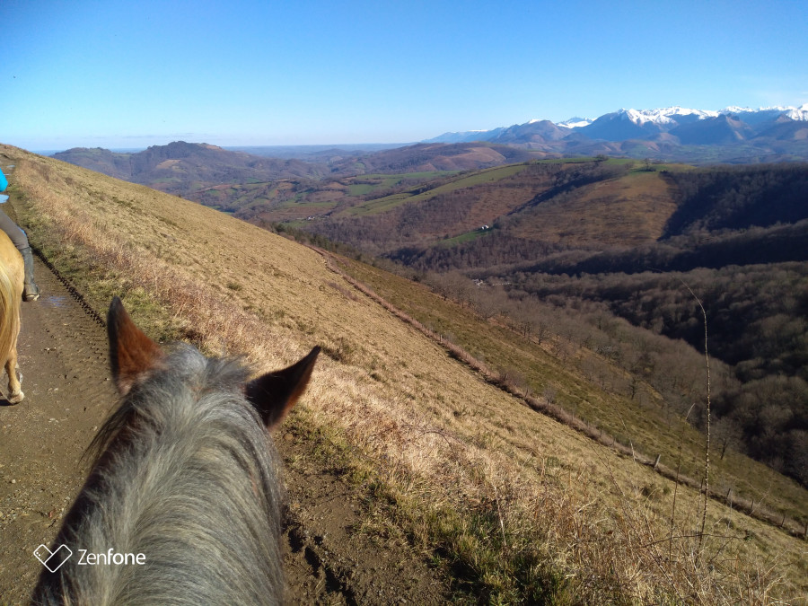 Rando organisé depuis le village de N* la propriétaire de Touco, dans les terres du pays basque ! Je suis partie hier en fin d'après-midi avec le van et les chevaux jusqu'à chez N* qui vient d'ouvrir un gîte équestre (elle fait chambres d'hôtes et ayant la place pour des chevaux elle fait maintenant aussi acceuil des cavaliers). Puis ce matin on a repris le van pour aller au départ de la rando qui se faisait au centre du village, rando par un temps idéal et de magnifiques paysages, d'ailleurs le pique-nique ce midi était en haut sur des crêtes c'était magnifique la vue !