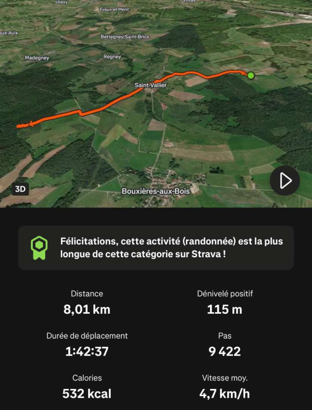 Résultat : 9,6 km en 55 mn, et une portion de travail de 6,9 km en 30 mn donc 13,8 km/h de moyenne sur le fractionné.