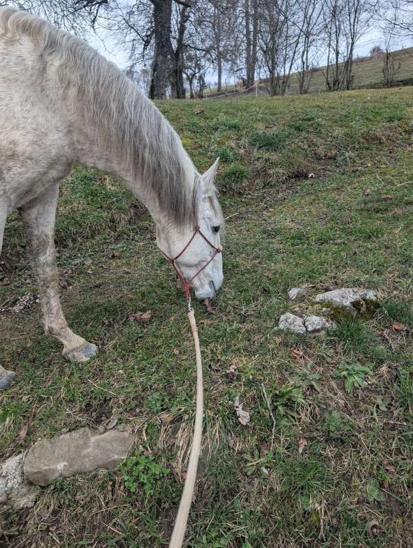 C'est une glouton en temps normal alors j'ai grave paniqué surtout quand l'assistante vétérinaire m'a demandé si elle arrivait ou non à déglutir (c'est ce qui devait définir une intervention d'urgence dans la journée ou pouvant attendre demain) et que j'étais incapable de lui répondre (la jument refusant de boire et se galérant avec le foin et sa poignée d'hartog digest). L'herbe ça semblait s'engloutir doucement mais je n'en étais pas certaine Tout ça sous pression d'arriver à l'heure au travail et avec un réseau téléphonique défaillant